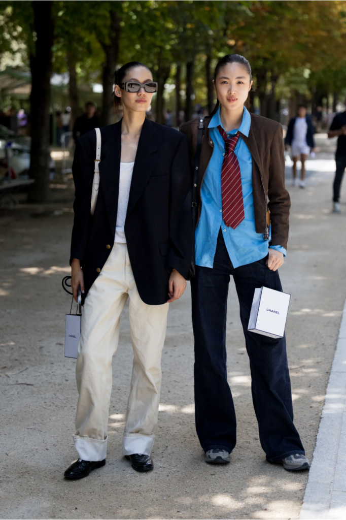 - Dark wide-leg jeans + shirt tucked into the waistband + leather loafers or pointed-toe shoes.
