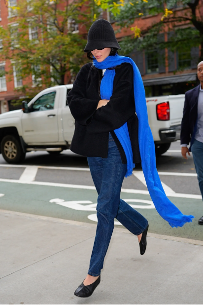 • Celebrities choose the simplest way – using only a cobalt blue scarf, hat, or bag, paired with a black coat and jeans.